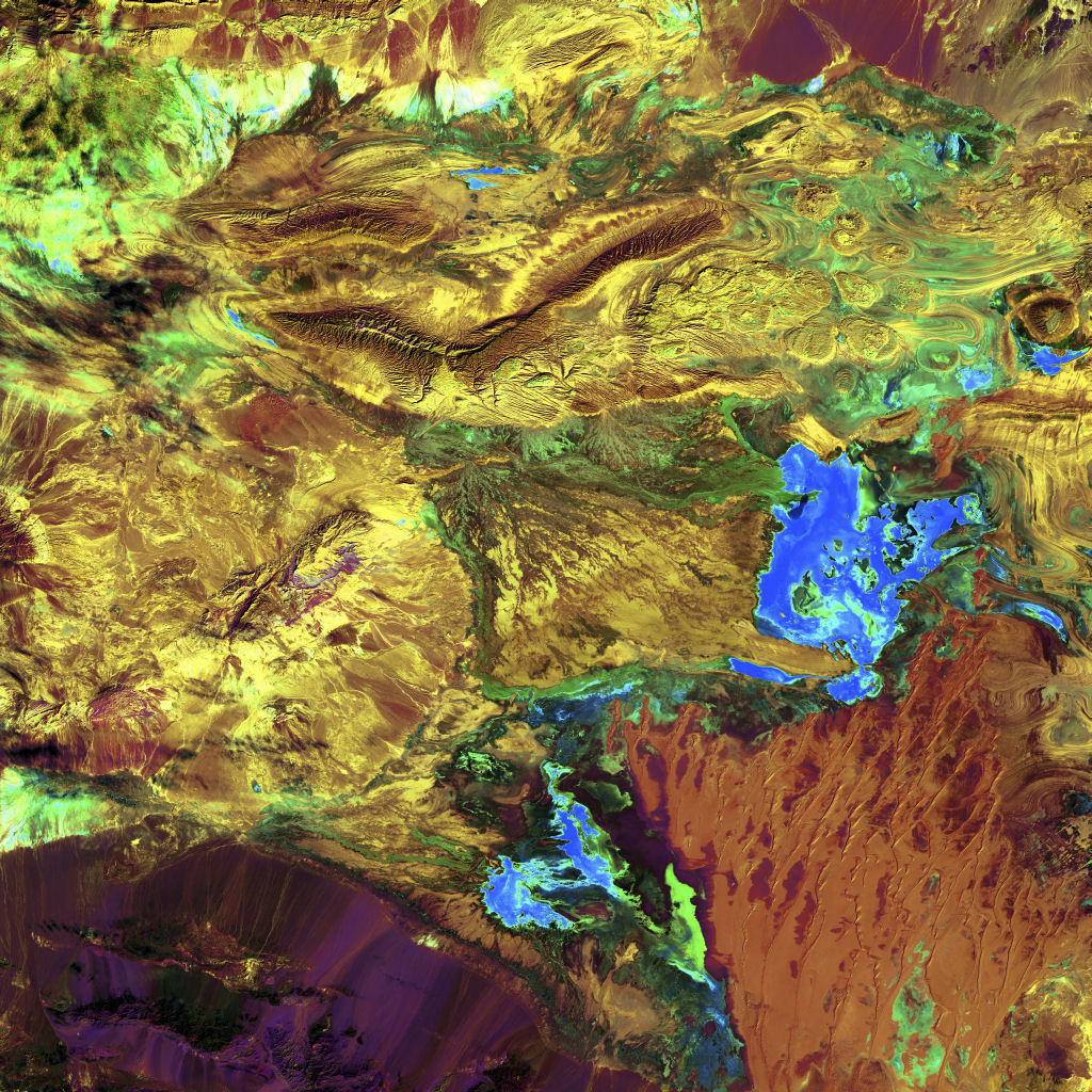 Like poster paints run wild, this image reveals an eclectic montage of landscapes in Iran’s largest desert, the Dasht-e Kavir, or Great Salt Desert. The word “kavir” is Persian for “salt marsh”. The almost uninhabited region covers an area of more than 77,000 square kilometres and is a mix of dry streambeds, desert plateaus, mudflats, and salt marshes. Extreme heat, dramatic daily temperature swings, and violent storms are the norm in this inhospitable place.