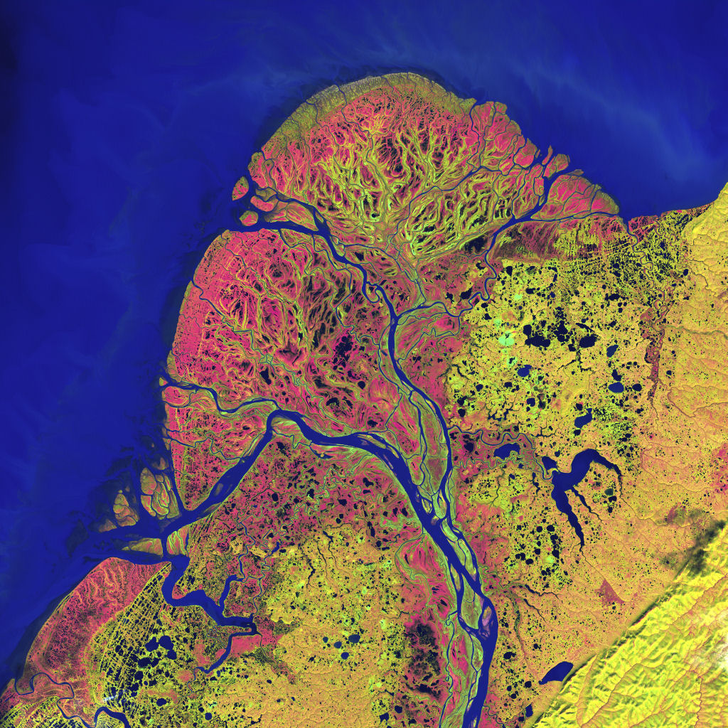 After beginning in northern British Columbia and flowing through Yukon in Canada, the Yukon River crosses Alaska, USA, before emptying into the Bering Sea. Countless lakes, sloughs, and ponds are scattered throughout this scene of the Yukon Delta. The river’s sinuous waterways seem like blood vessels branching out to enclose an organ.