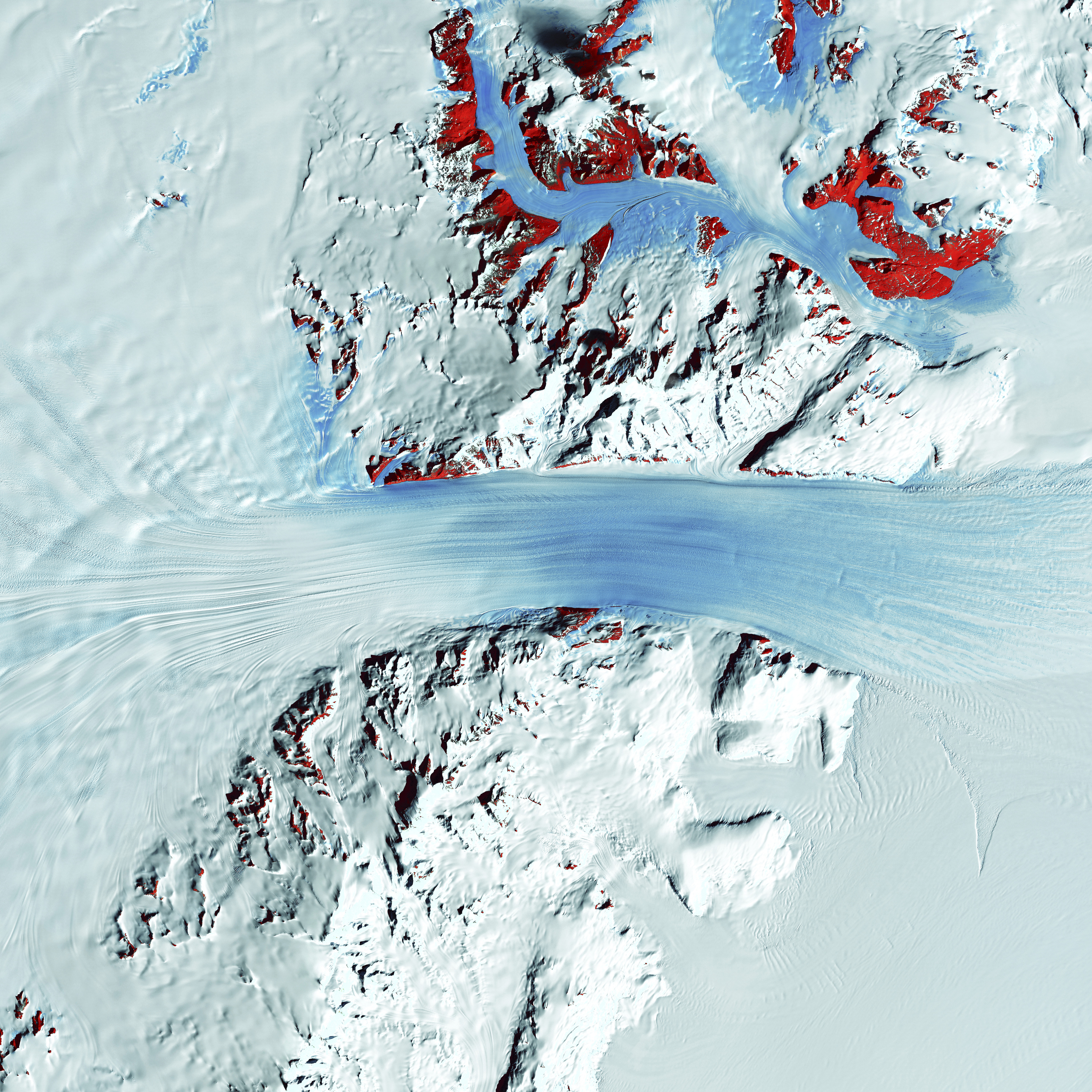 Truly a river of ice, Antarctica’s relatively fast-moving Byrd Glacier courses through the Transantarctic Mountains at a rate of 0.8 kilometers per year. More than 180 kilometers long, the glacier flows down from the polar plateau (left) to the Ross Ice Shelf (right). Long, sweeping flow lines are crossed in places by much shorter lines, which are deep cracks in the ice called crevasses. The red patches indicate areas of exposed rock.