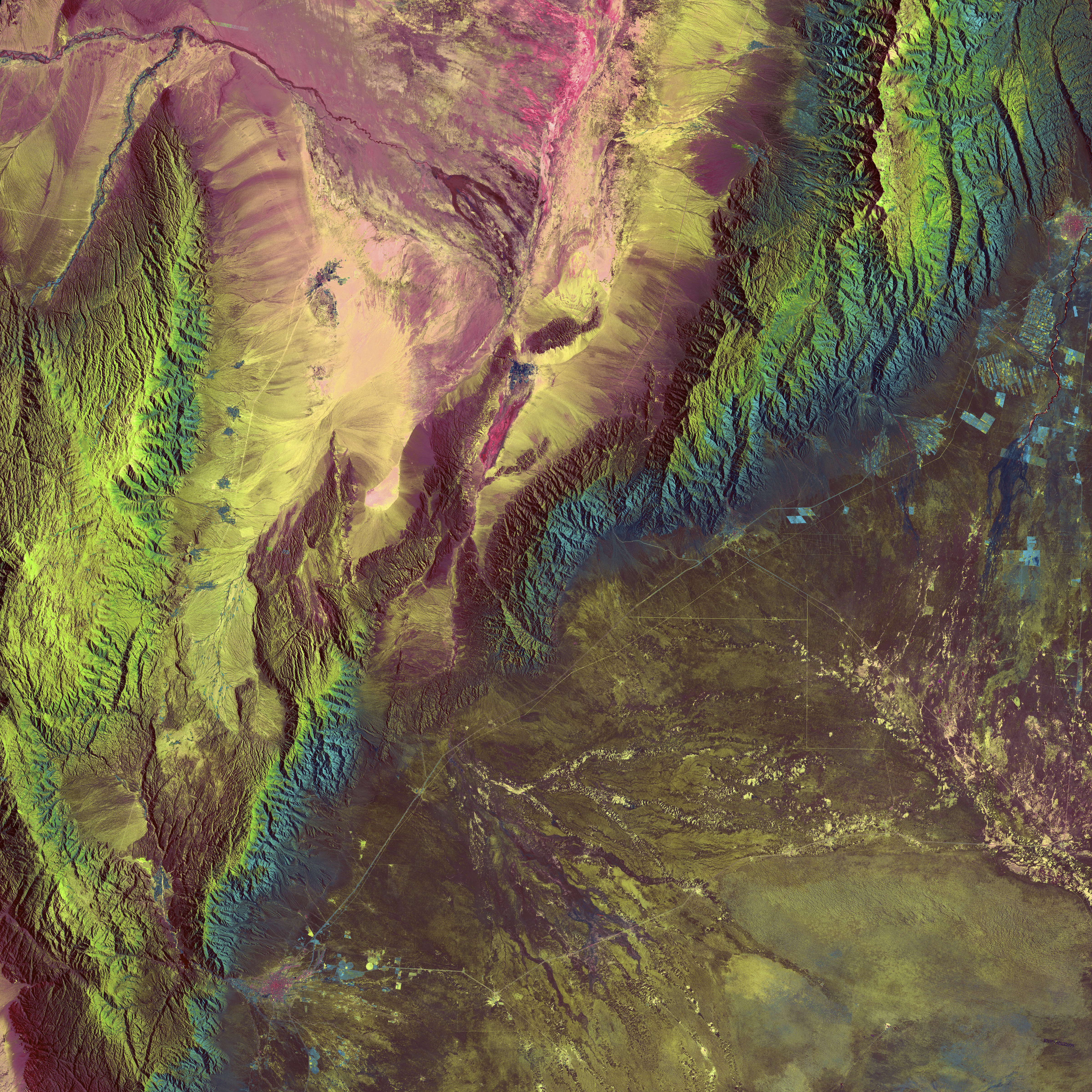 Shimmering blues and greens accentuate the textures of the Sierra de Velasco Mountains of northern Argentina. The urban area (pinkish circle) near the lower left part of the mountain range is La Rioja, the capital of the province of the same name. Follow the foothills to the upper right, where the city of San Fernando del Valle de Catamarca lies near extensive vineyards and fruit-growing areas (blue blocky shapes).