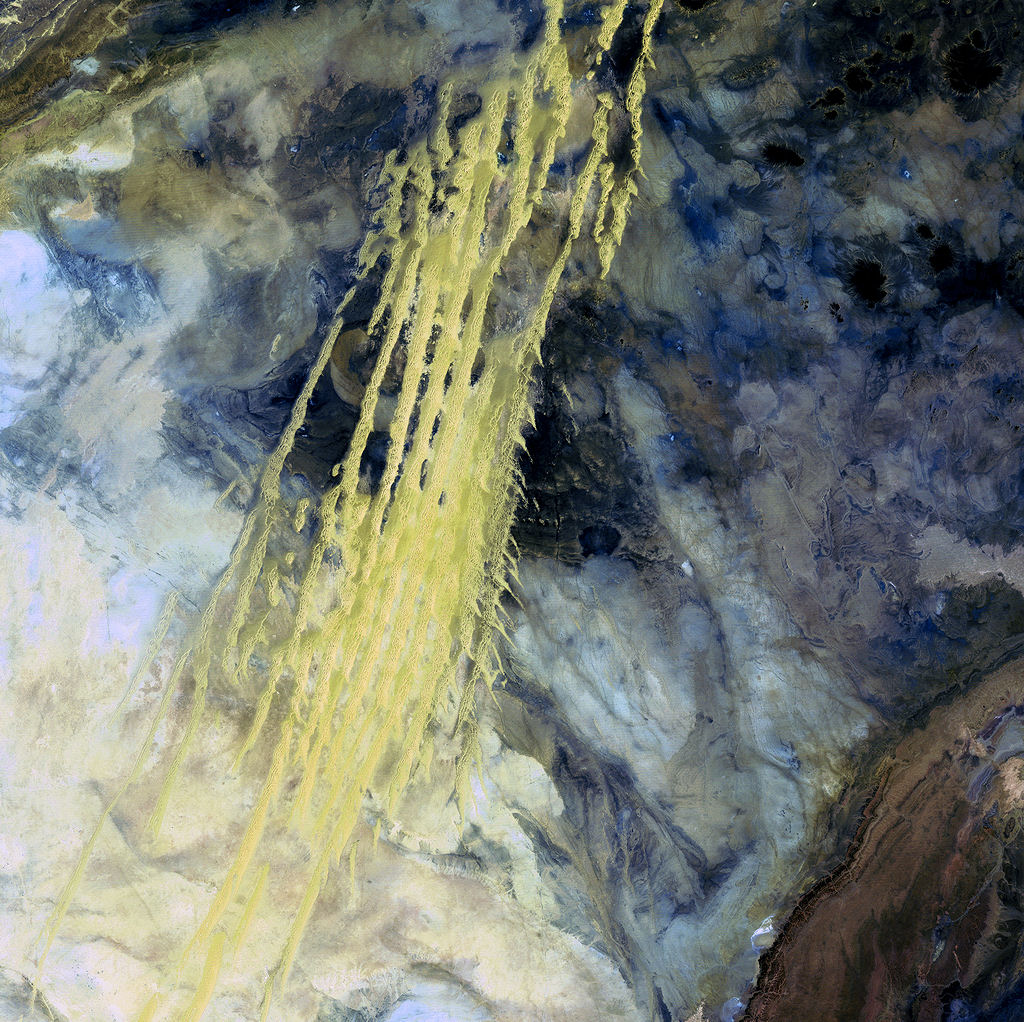 What look like pale yellow paint streaks slashing through a mosaic of mottled colors are ridges of wind-blown sand that make up Erg Iguidi, an area of ever-shifting sand dunes extending from Algeria into Mauritania in northwestern Africa. Erg Iguidi is one of several Saharan ergs, or sand seas, where individual dunes often surpass 500 meters in both width and height.