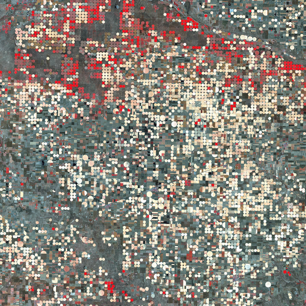 Center pivot irrigation systems created these circular patterns in crop land near Garden City, Kansas. The red circles indicate irrigated crops of healthy vegetation, the light-colored circles represent harvested crops.
